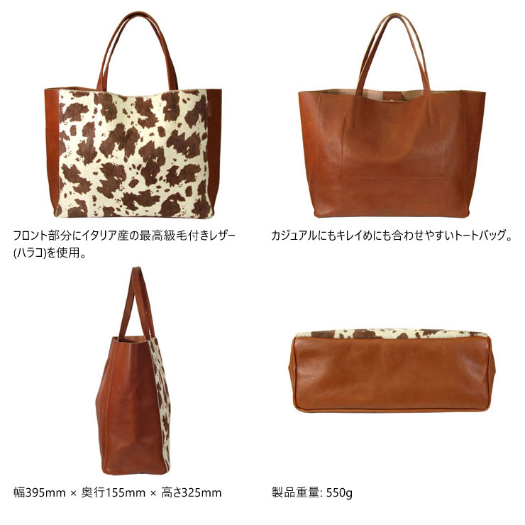 Detail 商品説明 ■素材:牛革 ■サイズ:W39.5× H32.5× D15.5(cm) ■重量:約550g フロント部分にイタリア産の最高級毛付きレザー(ハラコ)を使用した、B4サイズのレザートートバッグです。